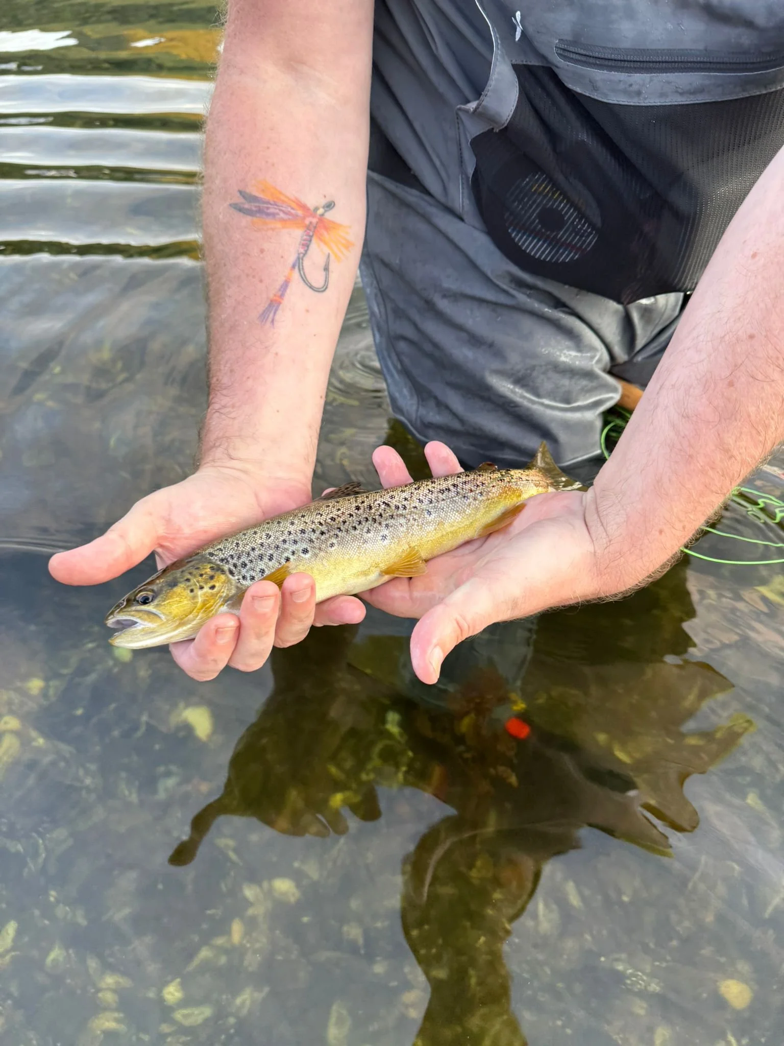 I got this tattoo a few years ago to remind me of good times on the river. Sometimes I need to remind myself that there’s plenty to look forward to in life. It’s a greenwells glory, because a salmon fly was too hard to copy! I just wanted a colourful fishing fly , life is colourful. It didn’t heal properly so is a bit patchy, but I like it that way as nothing is perfect. A good metaphor for all sorts of things